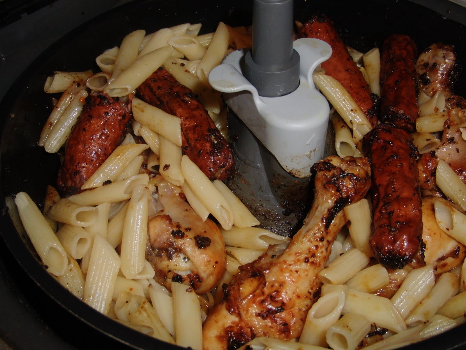 Tinha umas salsichas hot dog no frigo e antes que estragassem, juntei-as ao frango.. Ficou óptimo.