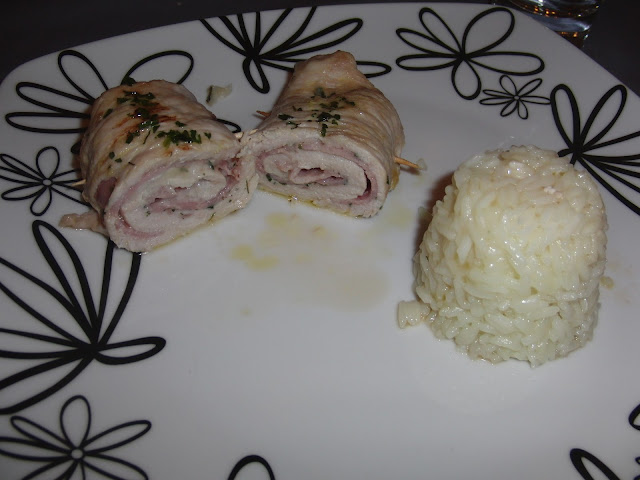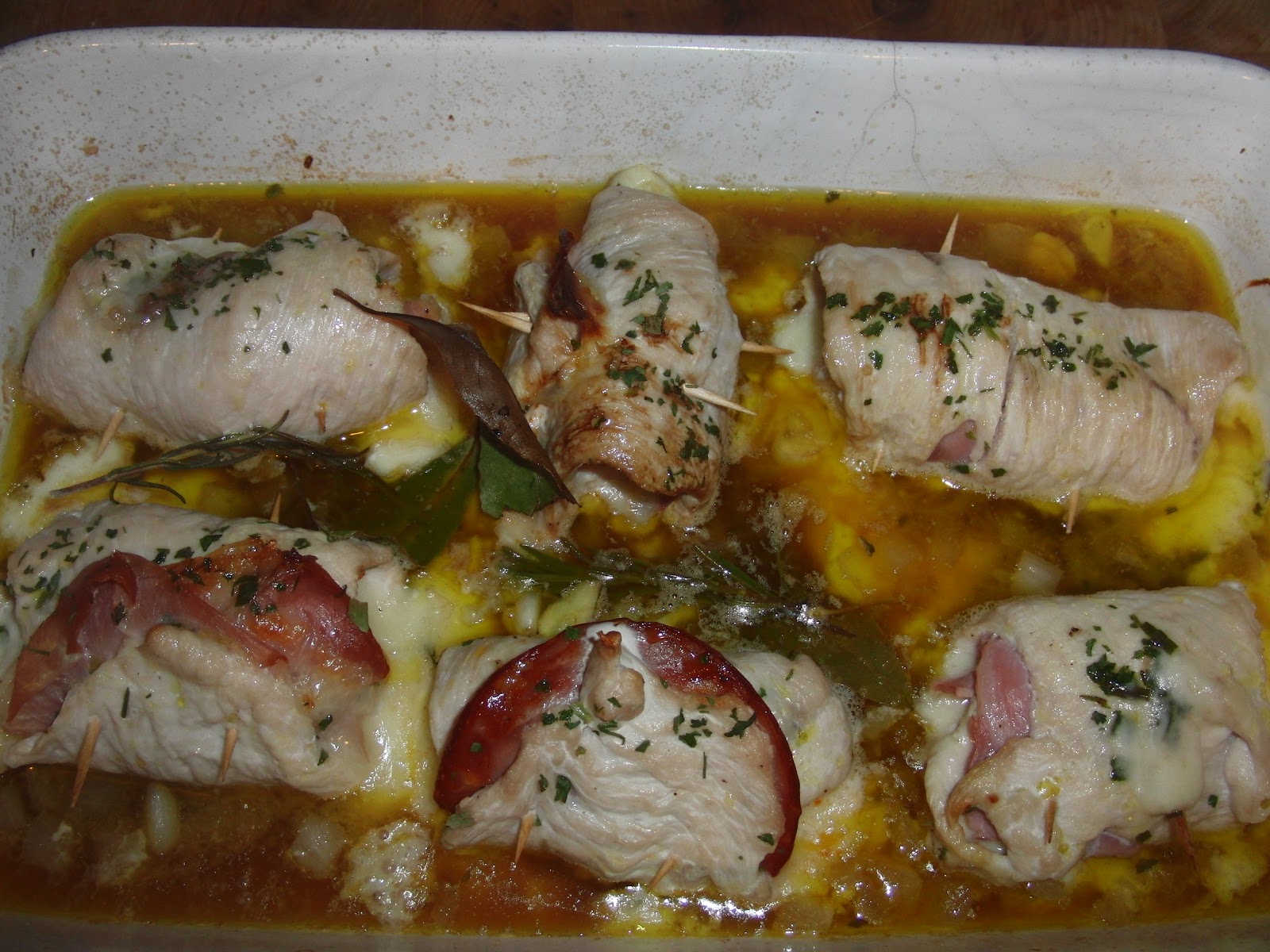 Temperar os bifes com sal, pimenta e ervas finas e cobrir com fatias de queijo e outra fatia a gosto (eu fiz 2 de presunto e queijo, 2 de chourição e queijo e 2 de bacon e queijo). Enrolar e prender com um palito.
