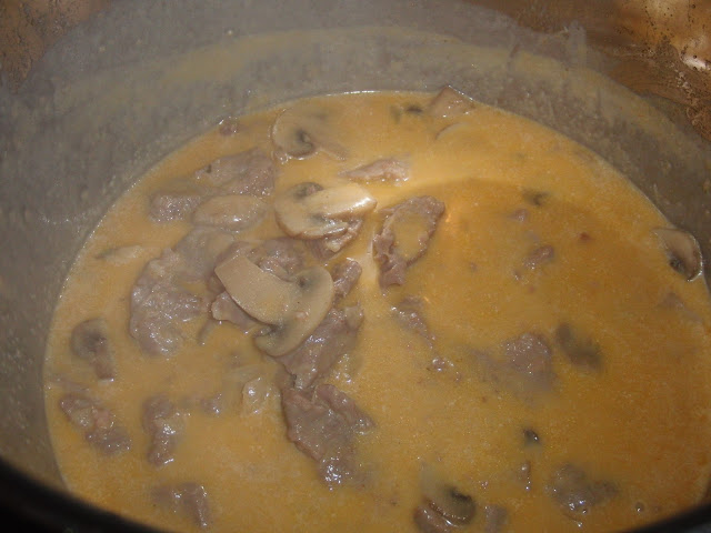 Colocar a carne novamente, os cogumelos, o bacon e o vinho, e temperar a gosto com sal e pimenta. Tapar e deixar cozinhar, em lume brando, durante 20 min, ou até a carne estar tenra. Juntar as natas e servir.