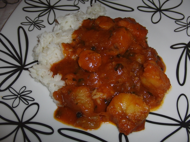 Adicione a malagueta e o caril à cebola e deixe refogar um pouco. Junte o tomate frito e um ramo de coentros atado.