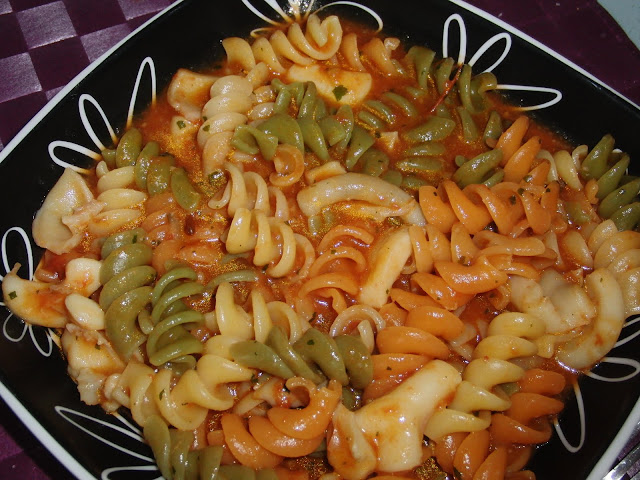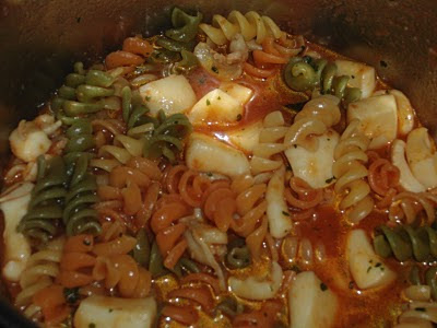Acrescentar a água, deixar ferver, rectificar o tempero. juntar a massa e deixar cozinhar.